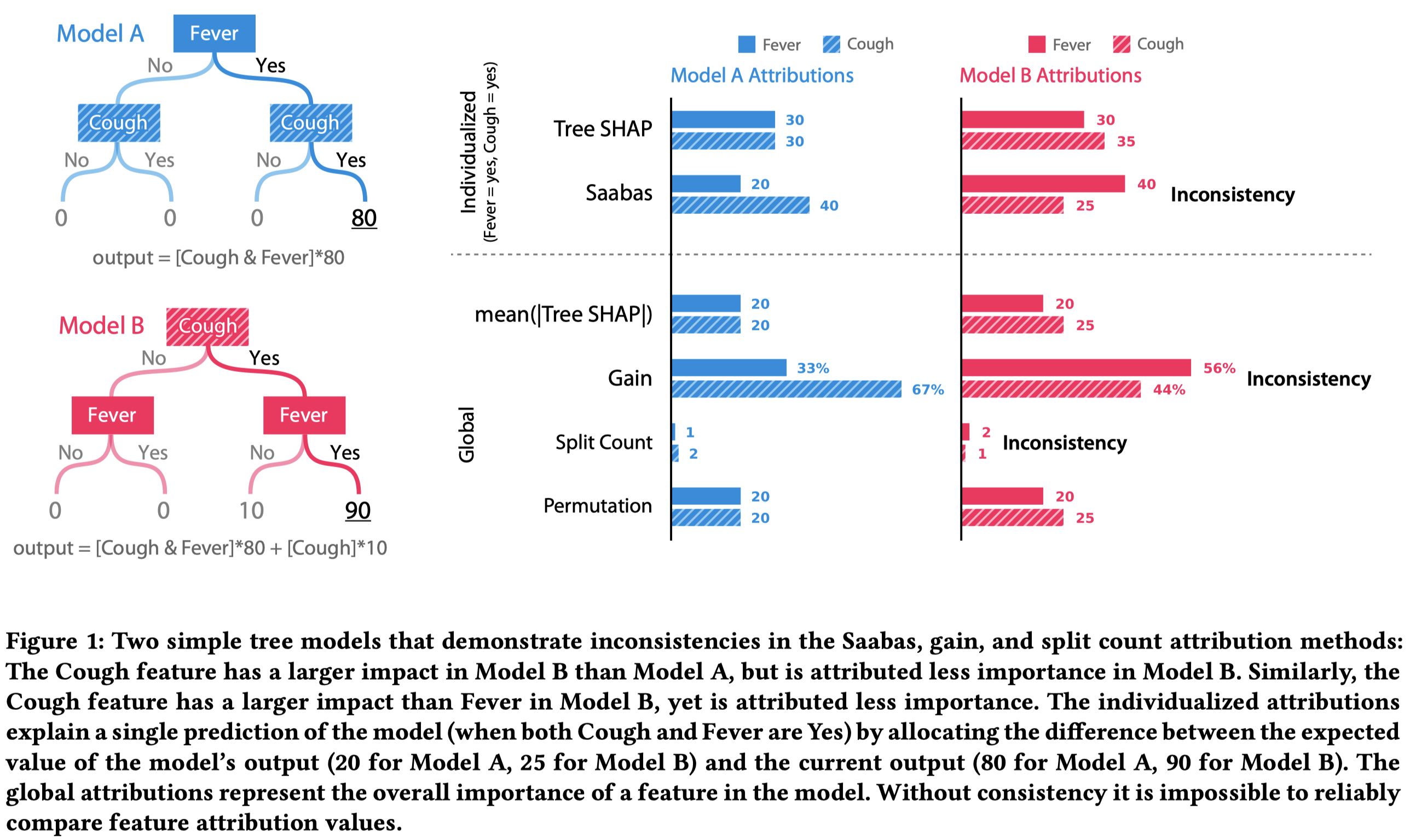 Tree Ensemble Model의 Feature Importance를 측정하는 기존의 방법(ex. Gini, Split Count 등)들은 모델(or 개별 Tree)마다 일관되지 않은(Inconsitency) 한계점이 있다고 한다.