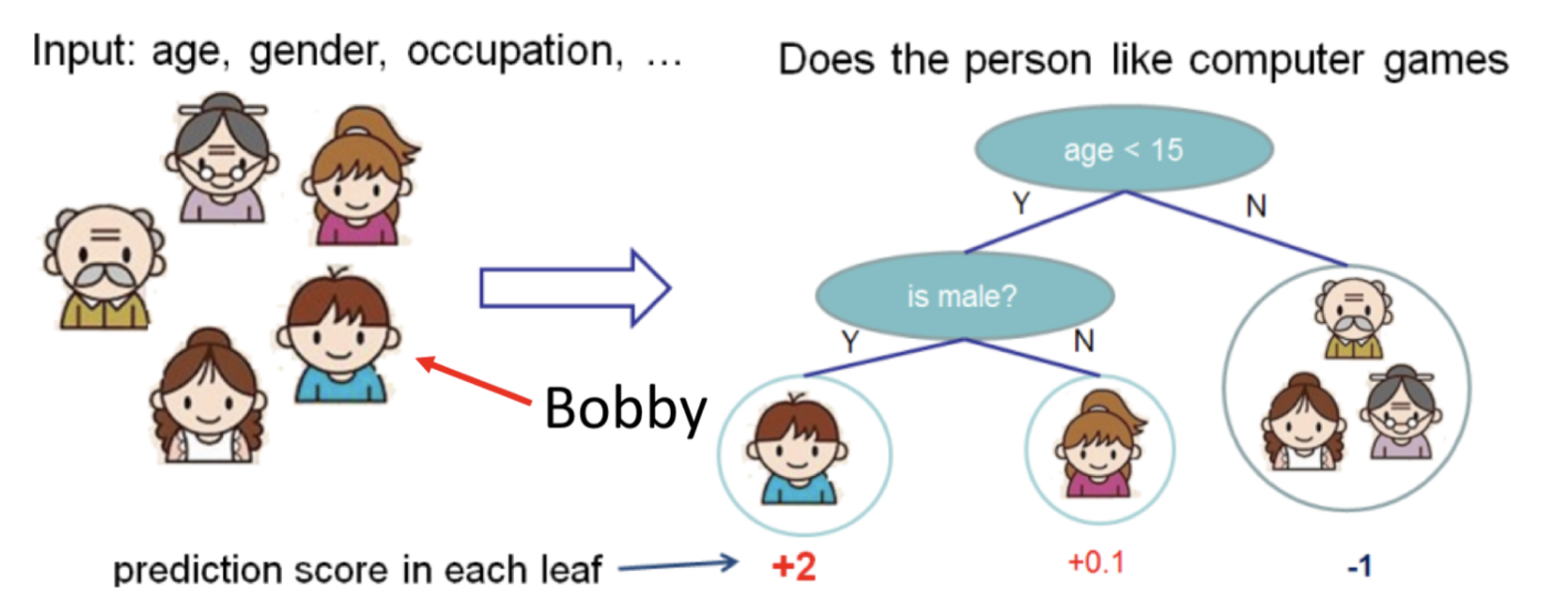 위와 같이 학습된 Tree 모델이 있고 Feature는 $age$와 $gender$만 있다고 사정하자. $age = 14, gender = male$인 Bobby에 대하여 Feature $age$의 Shapley Value $\phi_{Age}$를 계산해보자