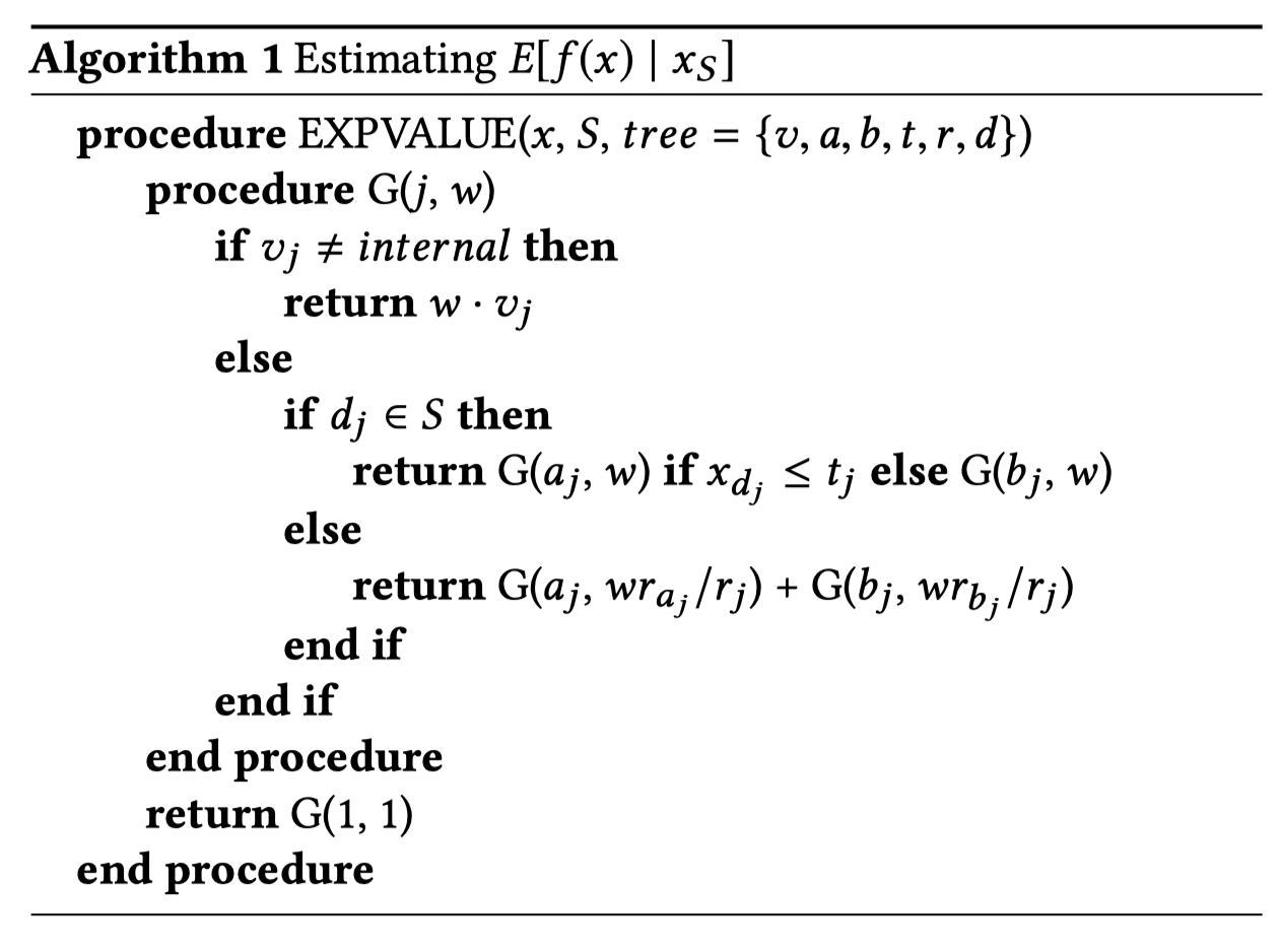 $w: proportion\ of\ the\ training\ samples\ matching\ the\ conditioning\ set\ S\ fall\ into\ each\ leaf$Input $s$와 Feature Set $S$와 한 Tree 모델 $tree = {v,a,b,t,r,d}$이 주어졌을 때, $E[f(x)\ |\ x_S]$을 계산한다. $E[f(x)\ |\ x_S]$은 $x_S$가 속하는 Leaf node의 score값과 해당 node에 속하는 Training 데이터의 비중을 곱하여 계산된다. 그 후 Ensemble 모델 Score를 계산할 때와 마찬가지로, 각 Tree의 $E[f(x)\ |\ x_S]$을 합하여 Ensemble 모델에 대한 최종 $E[f(x)\ |\ x_S]$를 계산한다.